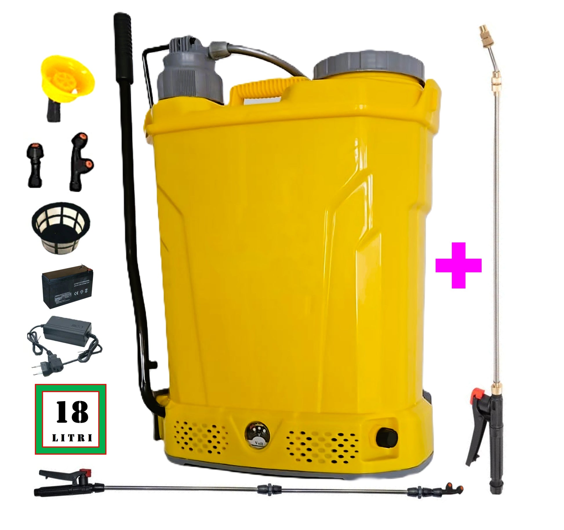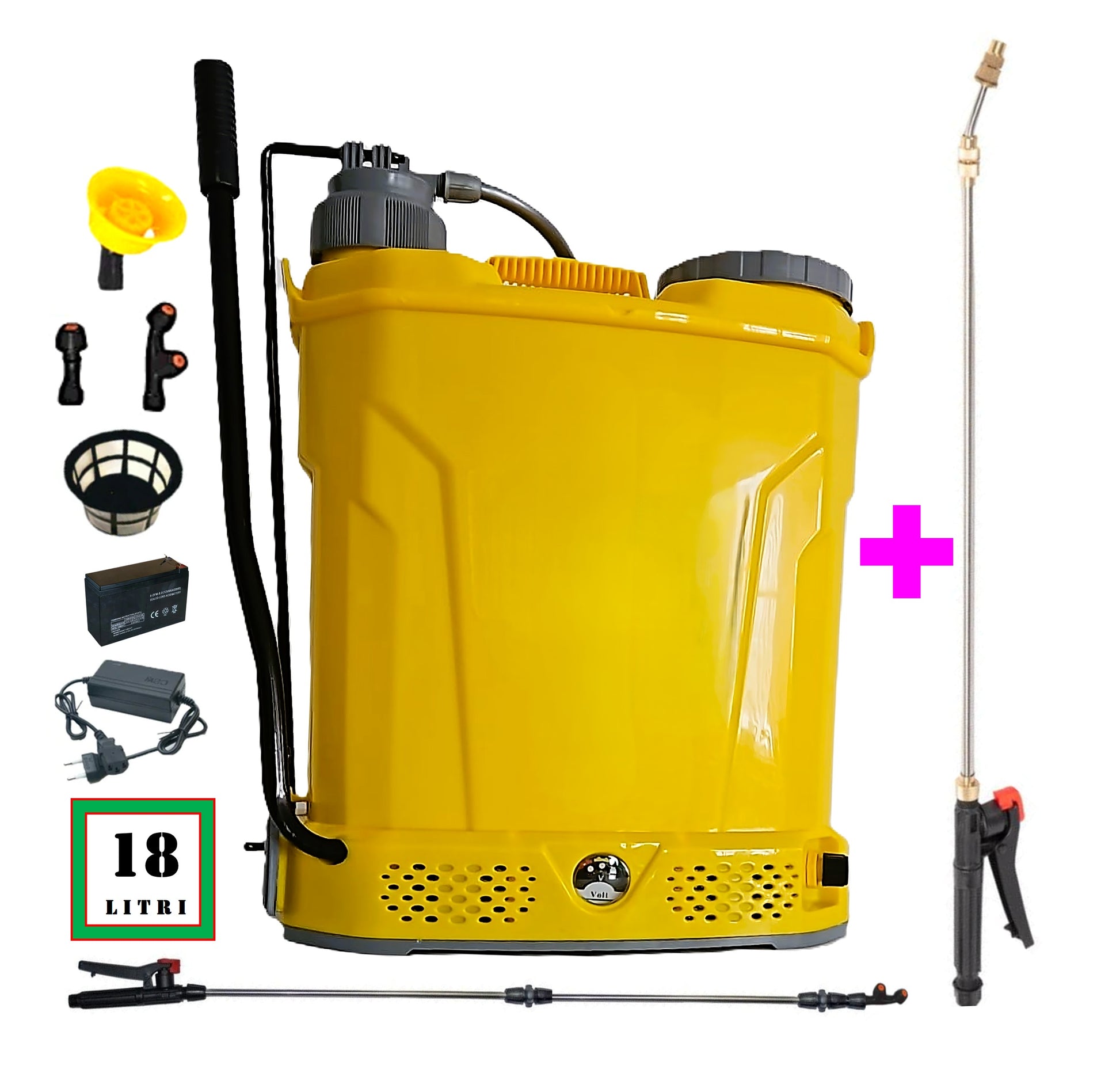 Vermorel de stropit 18 Litri cu acumulator electric+Manuala (2-in-1), GALBEN, familia de produse POMPINA© este o pompa de stropit electrica la care pulverizarea lichidului este realizata pe baza de presiune generata de motorul electric incorporat in corpul pompei. Alimentarea se realizeaza cu un acumulator de 12V-8AH, acesta fiind reincarcabil de la o sursa de curent alternativ de 220V utilizand un incarcator compatibil cu acumulatorul.