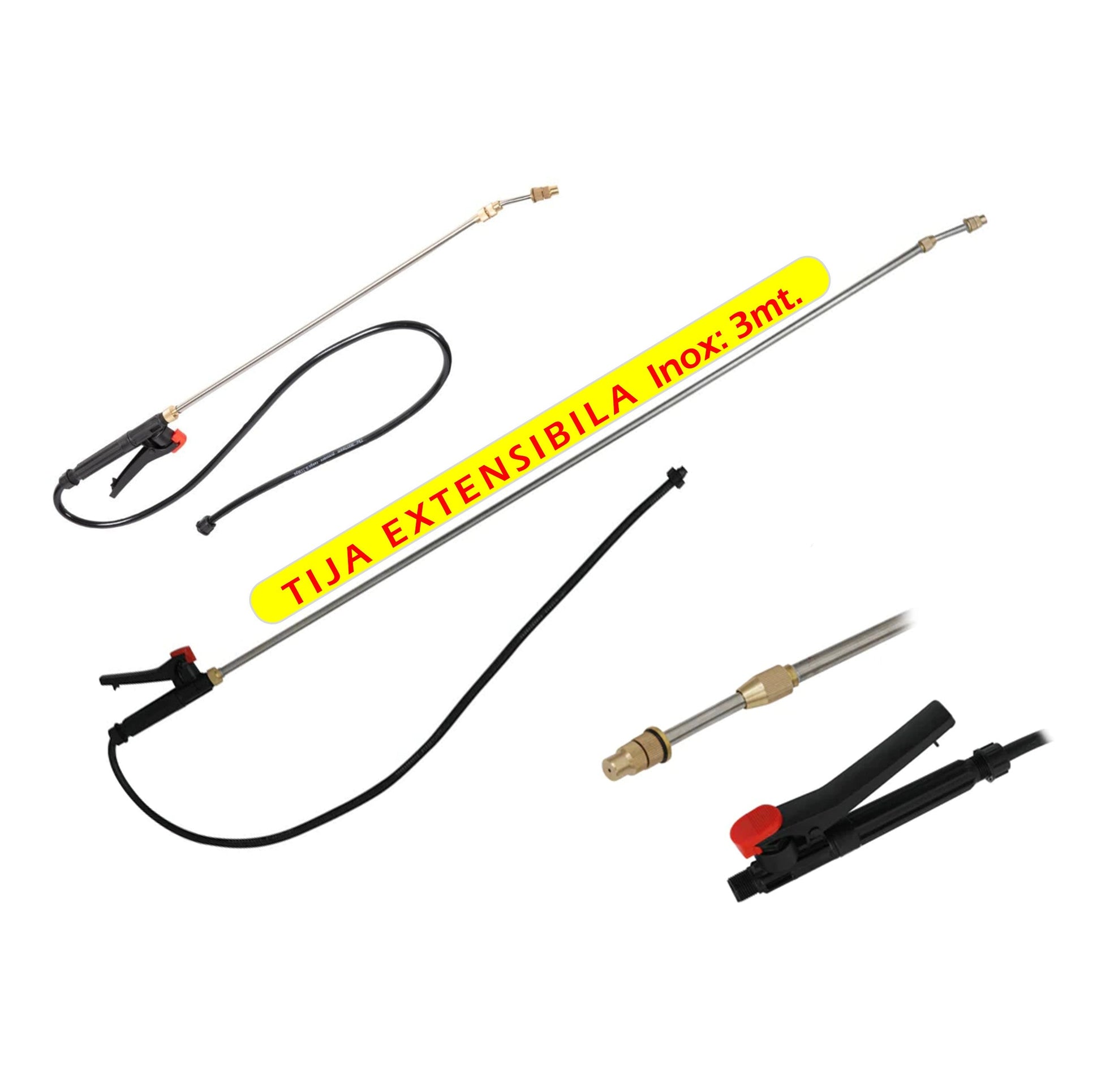 SETUL include o TIJA EXTENSIBILA din INOX cu duza reglabila din bronz. Tija este dotata cu maner din material plastic cu functie de pornire-oprire a jetului pulverizat, precum si cu furtun de conectare la corpul pompei de stropit.