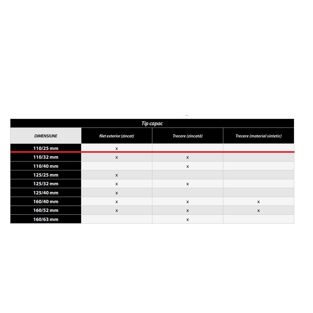 Capacul este utilizat pentru inchiderea ermetica a conductei de protectie din putul adanc prin care este scoasa conducta de refulare. Capacul asigura inchiderea stransa a putului datorita garniturii care se strange pe conducta de protectie. Datorita inchiderii stranse, putul este protejat impotriva patrunderii poluantilor si a apelor de suprafata.