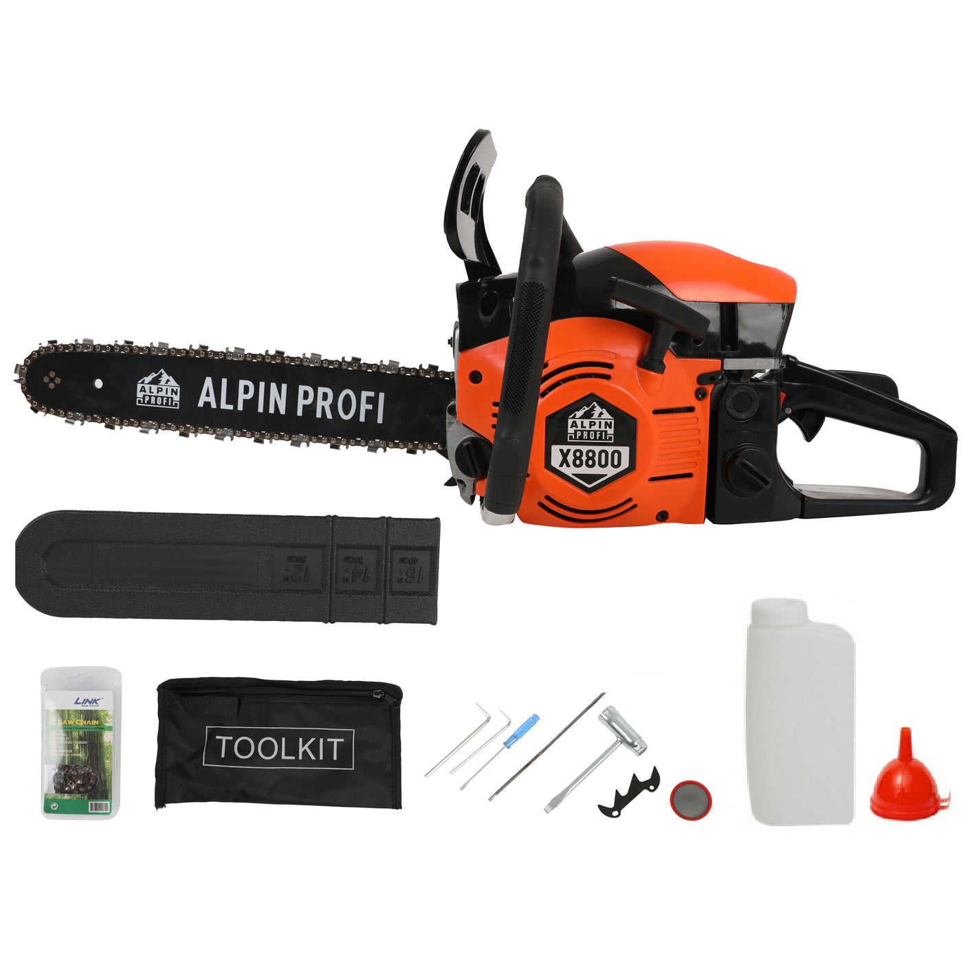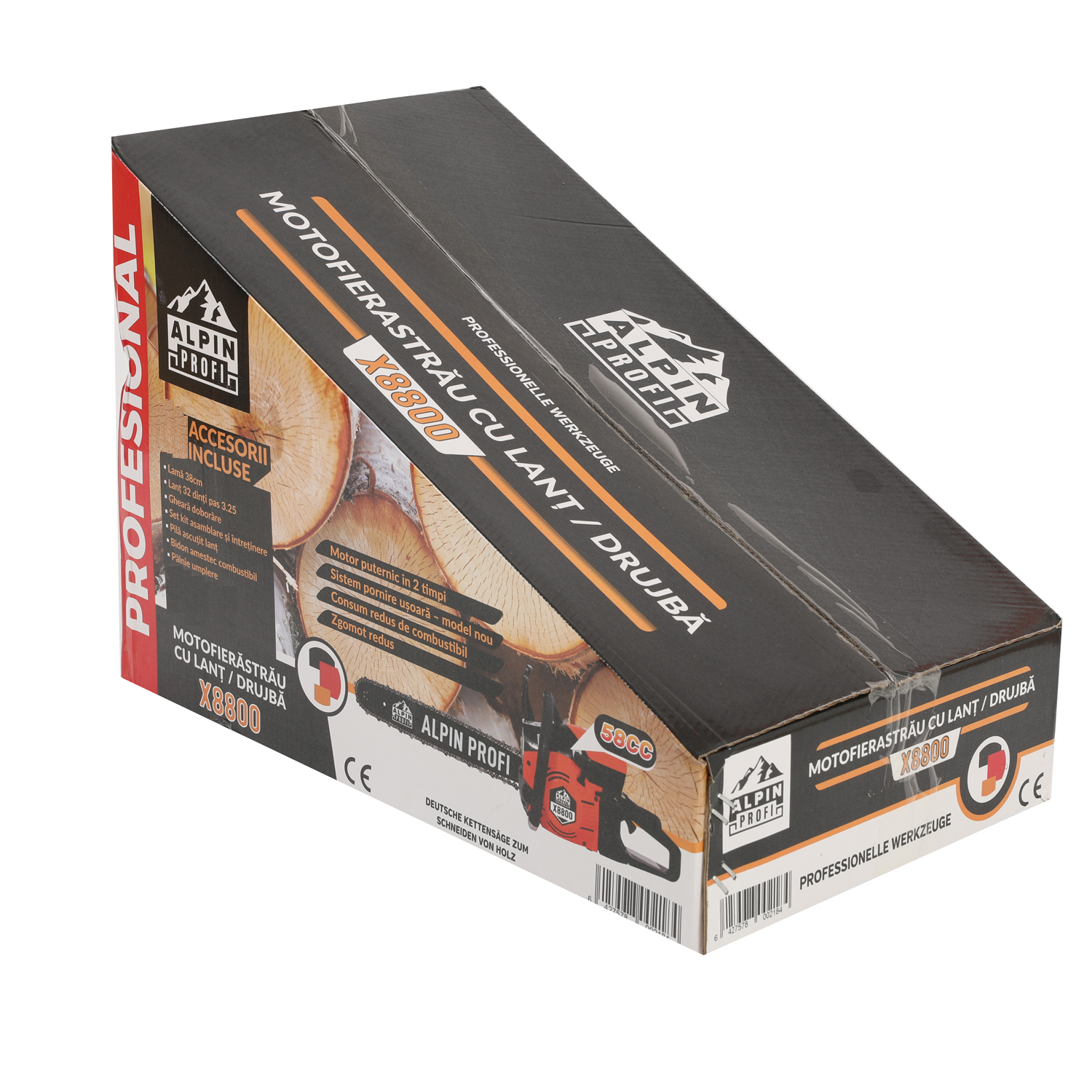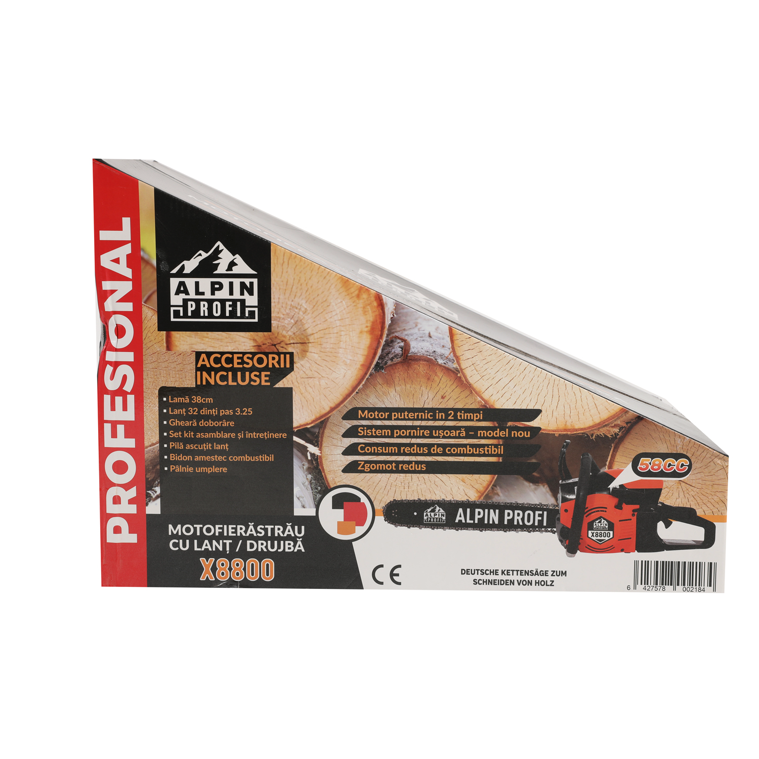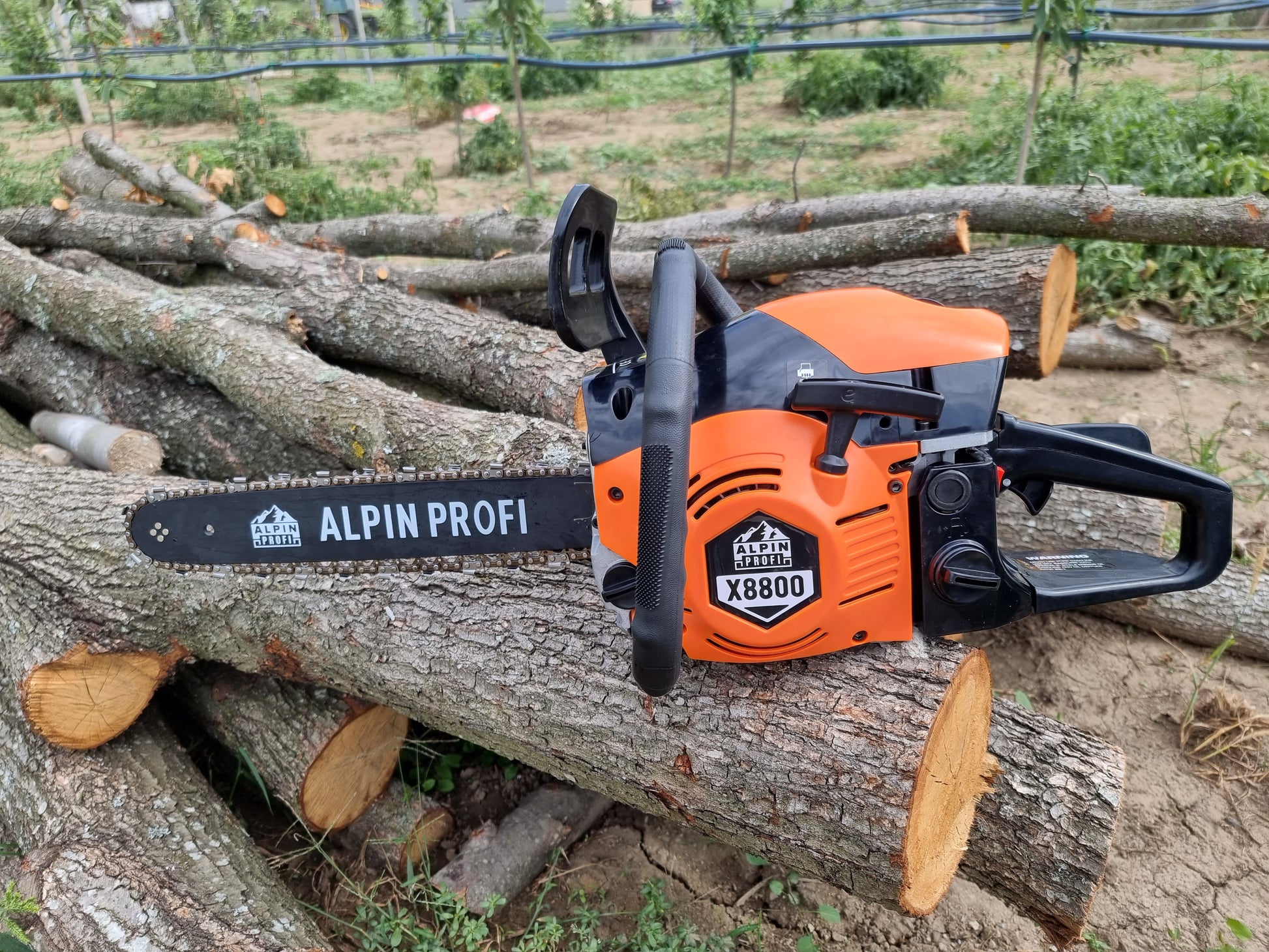 Drujba Alpin Profi X8800 pe benzina se caracterizează prin greutatea redusa, silentiozitate si simplitatea utilizarii, datorita careia aproape toata lumea se poate descurca cu utilizarea utilajului. Drujba pe benzina ALPIN PROFI este un utilaj extrem de eficient si confortabil, utilizat în gradina, livada, padure sau constructii. Fierastraiele pe benzina de la ALPIN PROFI sunt ideale pentru taierea tuturor tipurilor de lemn si lemn, (atat lemn de foc, cat si de gradina) taierea si taierea crengilor si de asemenea pentru lucrari pe santier.Ferastraul este echipat cu un motor puternic în 2 timpi care va satisface nevoile chiar și ale celor mai pretențioși.Echilibrul perfect al arborelui în combinație cu sistemul anti-vibratii asigura o eficientă ridicata si confort de lucru.