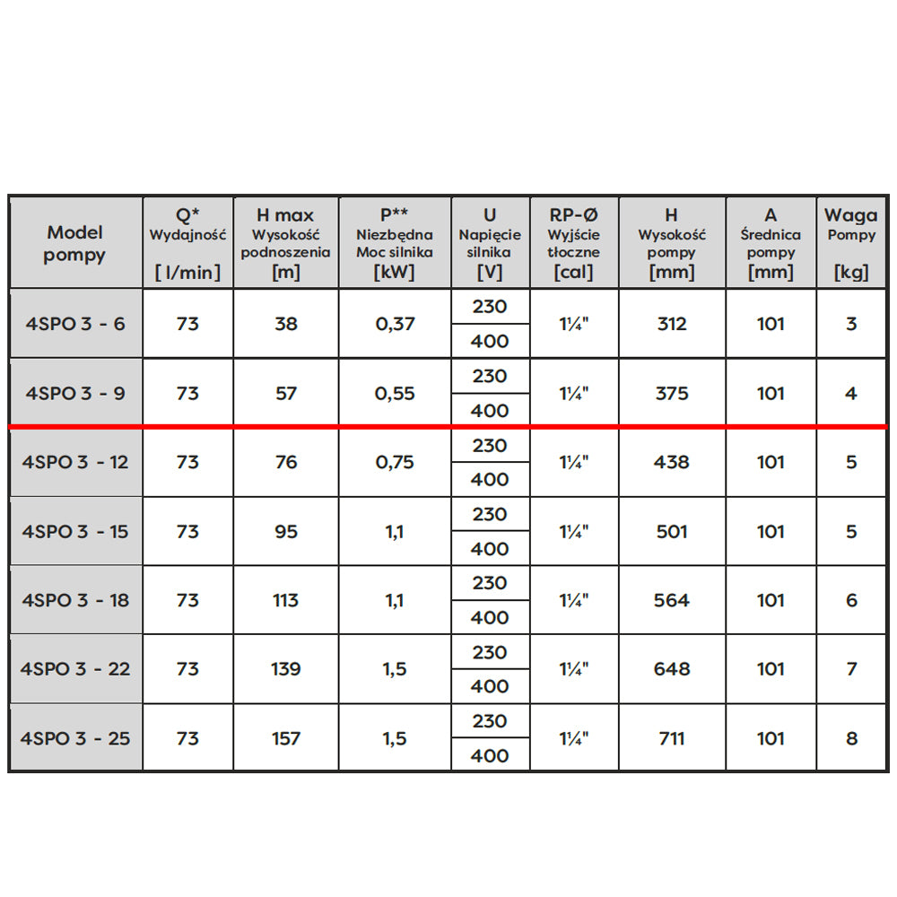 Pompa submersibila Omnigena 4SPO 3- 9, 230V, 0.55W, debit 73l/min, H refulare 57m