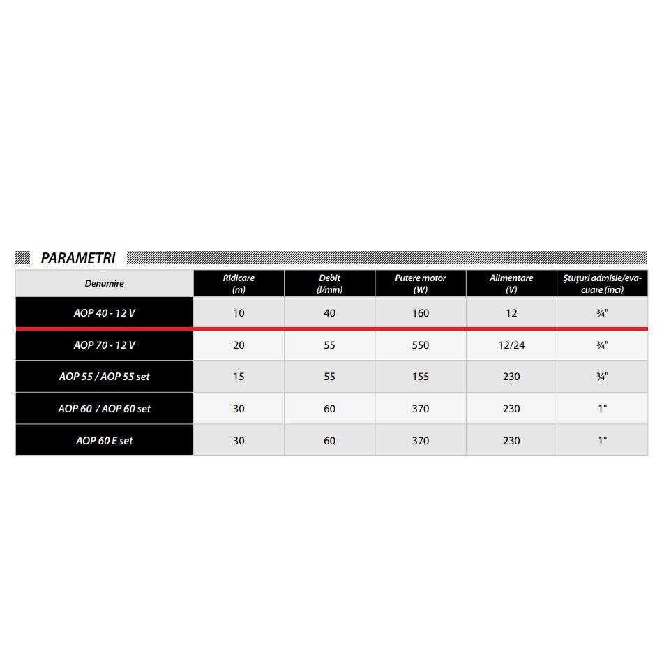 Pompele AOP40 - 12 V sunt alimentate cu curent continuu de la instalatiile de baterii cu o tensiune de 12 V. Pompele au fost echipate cu o supapa de preaplin de tip ”by-pass”.