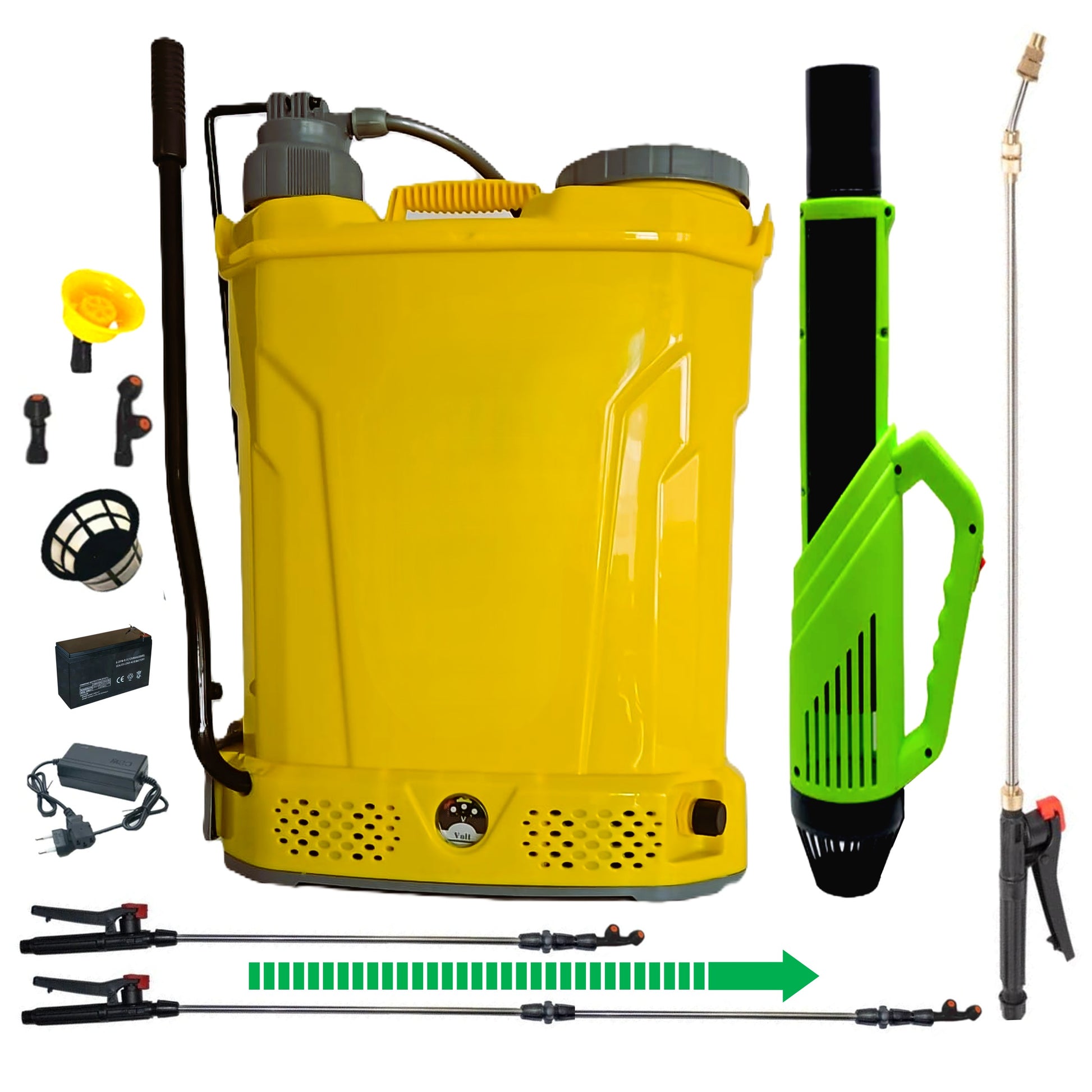 Pompa stropit 18 Litri cu acumulator electric si Manuala (2-in-1), Vermorel GALBEN, familia de produse POMPINA© este o pompa de stropit electrica la care pulverizarea lichidului este realizata pe baza de presiune generata de motorul electric incorporat in corpul pompei. Alimentarea se realizeaza cu un acumulator de 12V-8AH, acesta fiind reincarcabil de la o sursa de curent alternativ de 220V utilizand un incarcator compatibil cu acumulatorul.