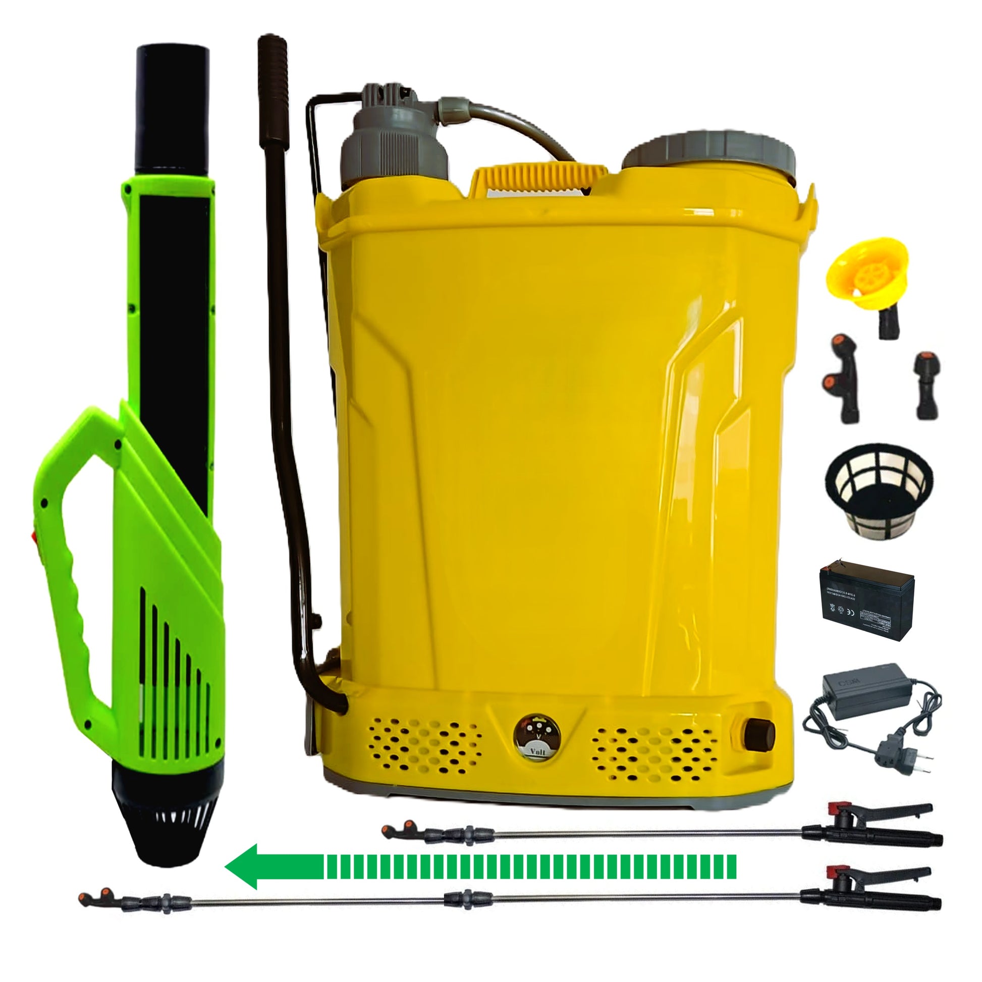 Pompa stropit 18 Litri cu acumulator electric si Manuala (2-in-1), Vermorel GALBEN, familia de produse POMPINA© este o pompa de stropit electrica la care pulverizarea lichidului este realizata pe baza de presiune generata de motorul electric incorporat in corpul pompei. Alimentarea se realizeaza cu un acumulator de 12V-8AH, acesta fiind reincarcabil de la o sursa de curent alternativ de 220V utilizand un incarcator compatibil cu acumulatorul.