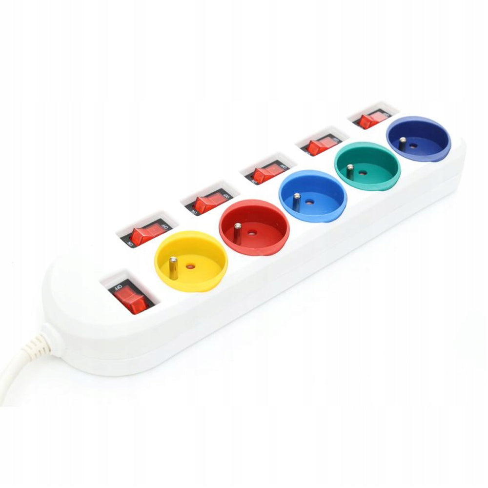 Prelungitor electric cu cablu lung de 1,5 m, cu 5 prize colorate si intrerupator principal, cu protectie pentru copii. Pentru identificarea usoara a cablurilor conectate, se utilizeaza marcaje individuale de culoare ale fiecarei prize.