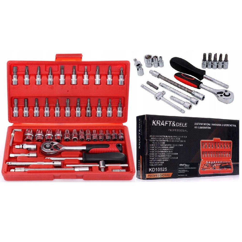 Trusa scule Kraft&Dele de la marca poloneza Kraft & Dele include un clichet, echipat cu un mecanism de clichet rezistent. Setul include o gama larga de prize (dimensiuni de la 4 la 14 mm) si bucati de surubelnita (plate, in cruce, hexagonale, Torx). Este completat de extensii (inclusiv una flexibila), o articulatie universala, chei hexagonale, un maner in T si un suport pentru biti. Elementele sunt sortate intr-un caz practic. Setul va fi perfect atat pentru utilizare profesionala, cat si pentru amatori. Productia profesionala si otelul crom-vanadiu intarit ii asigura fiabilitatea si durabilitatea. Toate dimensiunile cheilor sunt marcate pentru confortul dumneavoastra.
