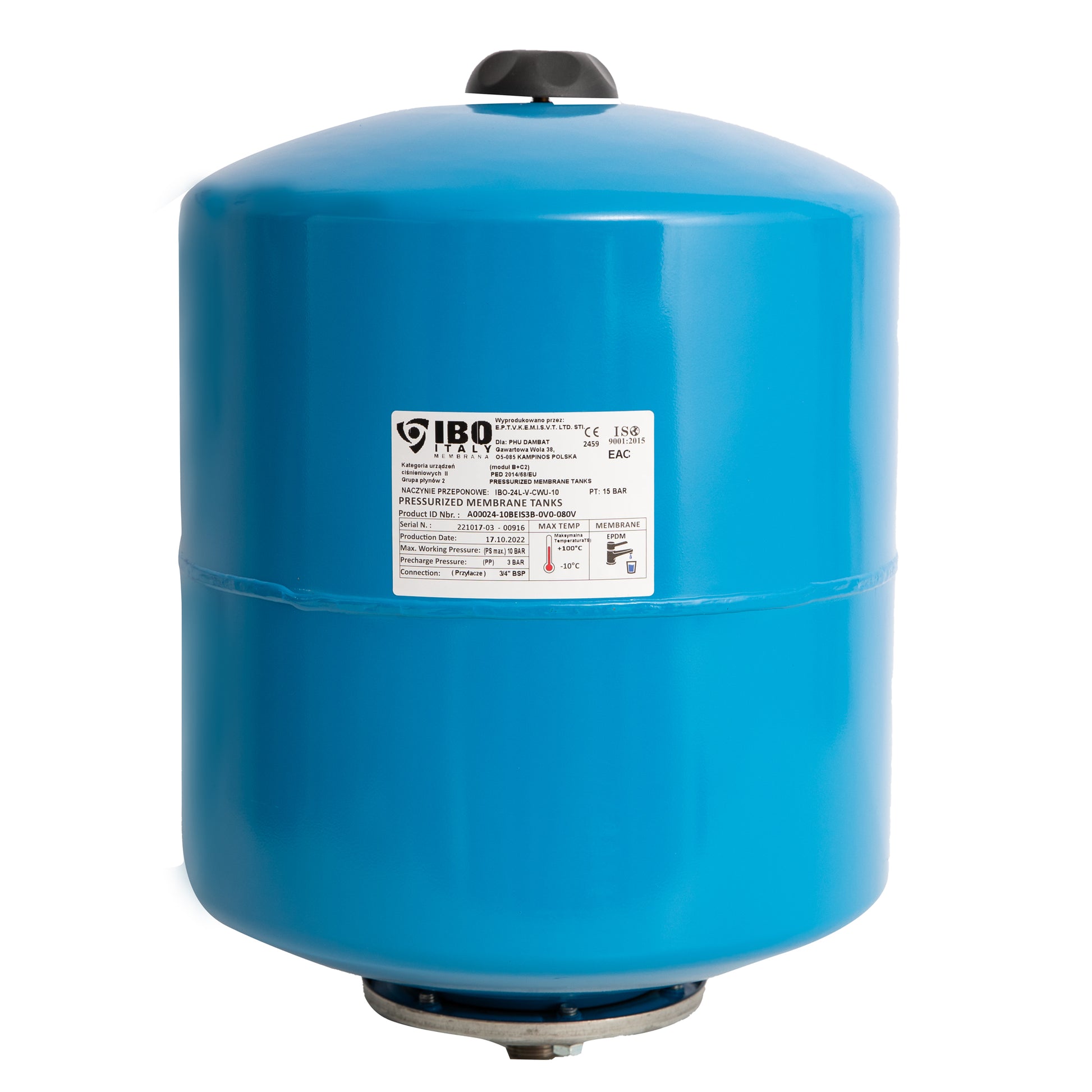 Materialele originale italiene de inalta calitate, care sunt supuse unei testari exigente la fiecare etapa de productie, si experienta in specialitate a inginerilor italieni asigura o rezistenta ridicata la uzura. Vasele cu diafragma IBO C.W.U. cu capacitati de 8L-50L sunt utilizate in instalatii de apa calda si rece potabila, pentru a mentine si egaliza presiunea in instalatii, a carei modificarea rezulta din cresterea volumului de apa. Rezervoarele au fost fabricate din otel carbon gros si acoperite cu un lac anticoroziv special. In interiorul rezervoarelor se afla diafragme de cauciuc, fabricate din butil (produse in fabrica din Italia) care formeaza o perna de aer intre apa aflata in interior si mantaua exterioara a rezervorului. Temperatura maxima de functionare a lichidului pe termen lung este de 110°C si pana la doua ore chiar pana la 130°C. Rezervoarele au fost echipate cu o supapa speciala pentru pomparea suplimentara sau evacuarea aerului din rezervor - un ventil identic cu cel auto, fiind situat in spatele rezervorului, sub capac.